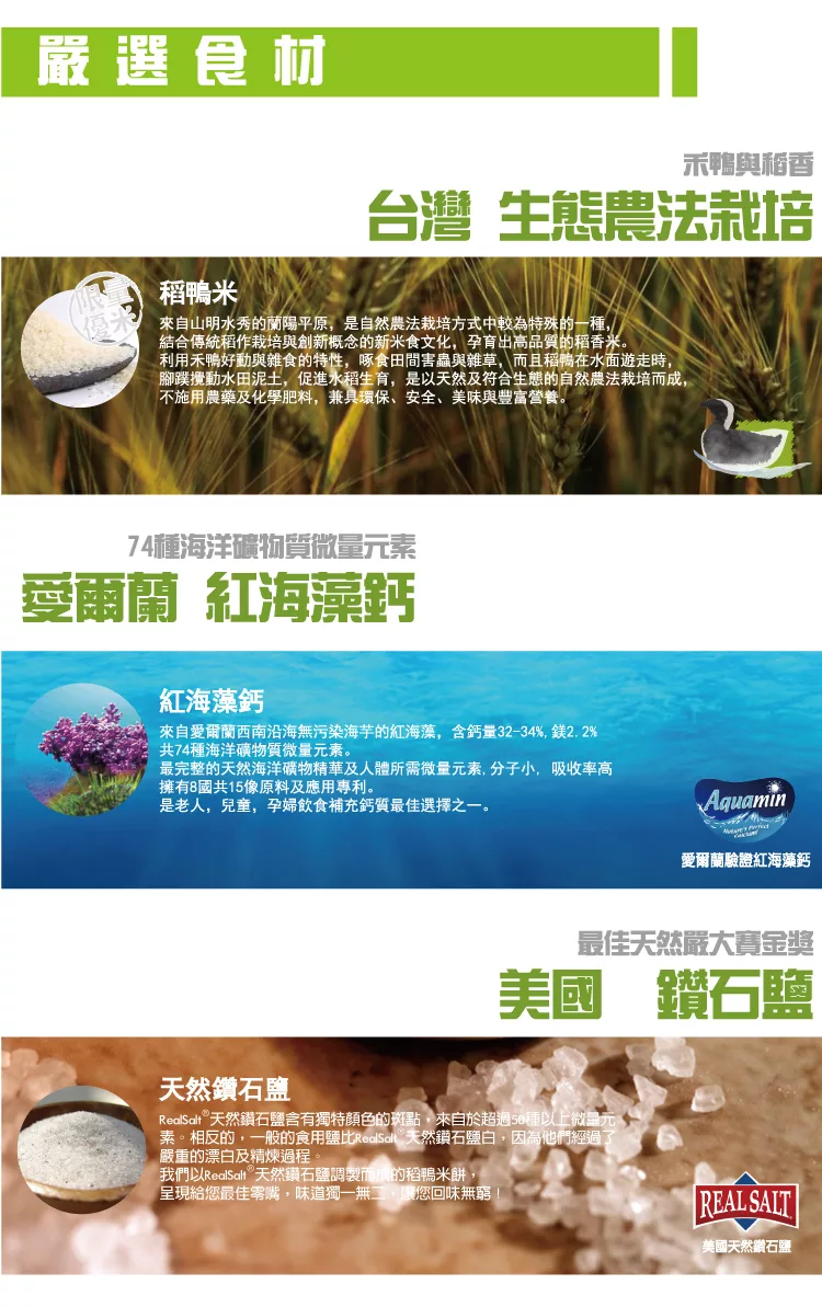 絕對不同!並且有超過35,000位的主廚同意這個說法!在美國烹飪協會主辦,由世界各地知名主廚擔任評審的最佳天然鹽大賽中,RealSalt®天然鑽石鹽榮獲了金牌肯定,我們希望您能親身體驗以RealSalt®天然鑽石鹽調味的美好人生稻鴨米餅。