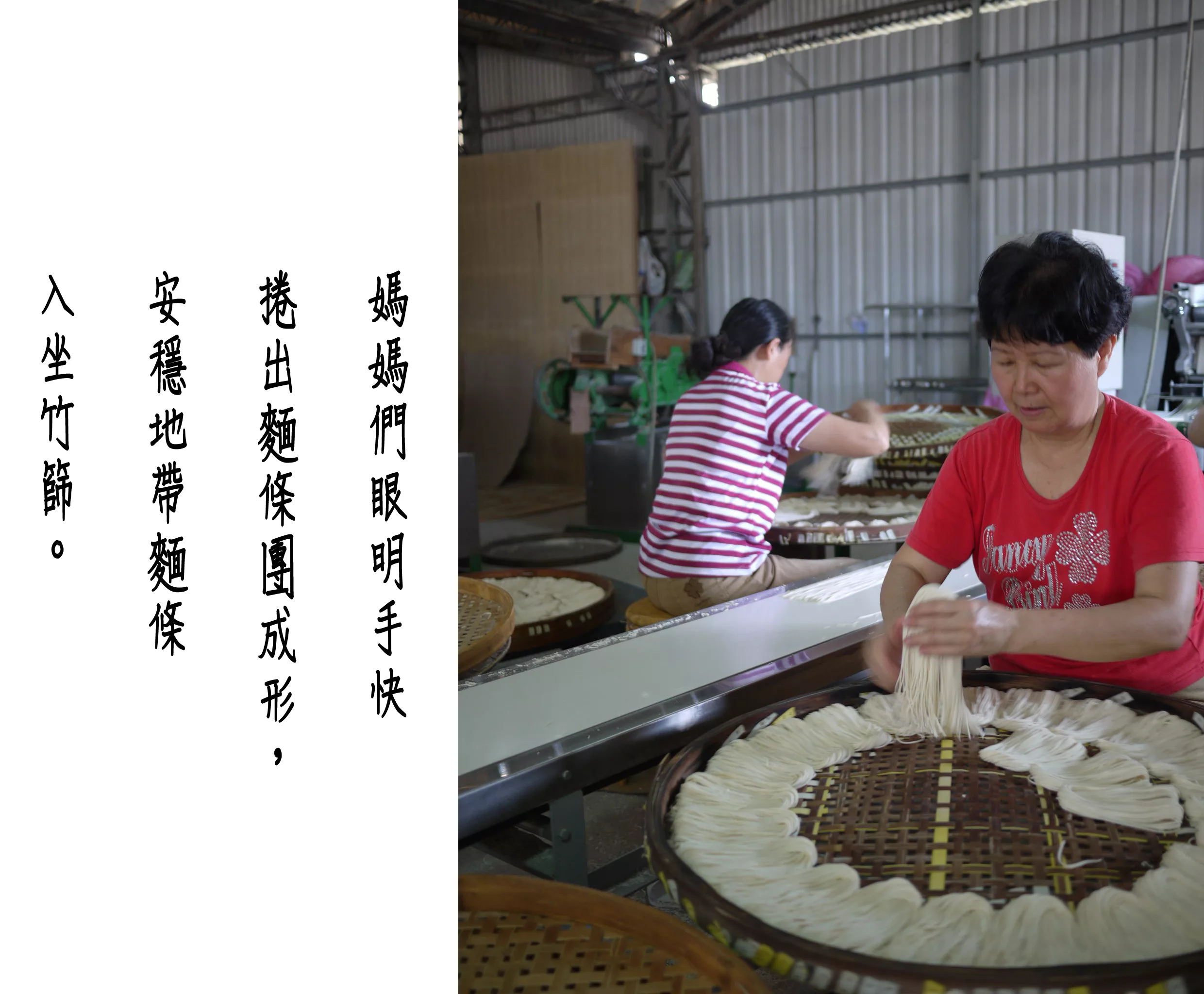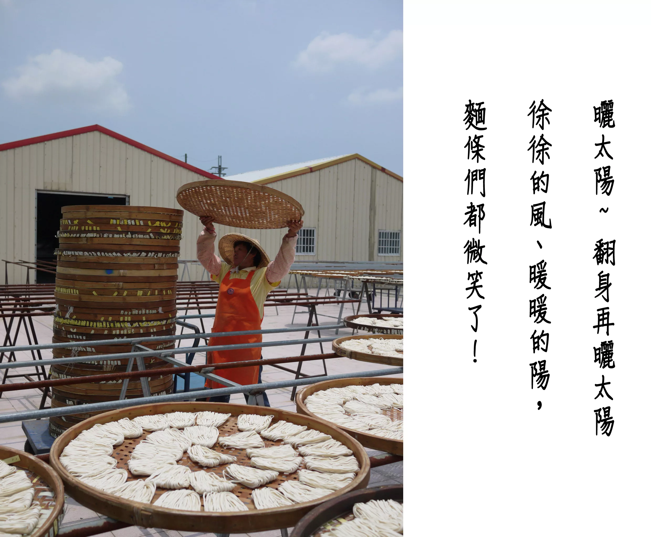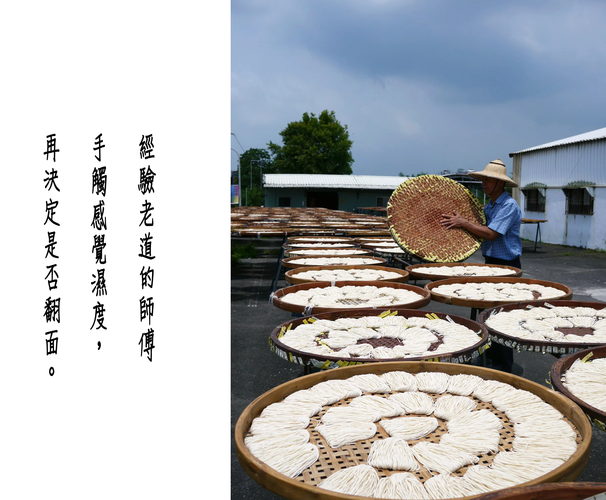 將一天就可以曬好的麵線,分兩天曬,讓麵在夜裡釋出水份,讓麵更耐煮、更有彈性。