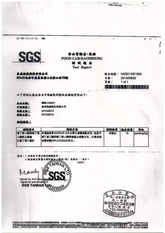 本關廟麵製作原料為:麵粉、鹽、水。麵粉經SGS檢驗,未測出順丁西二酸與順丁稀二酸酐,檢驗報告如圖