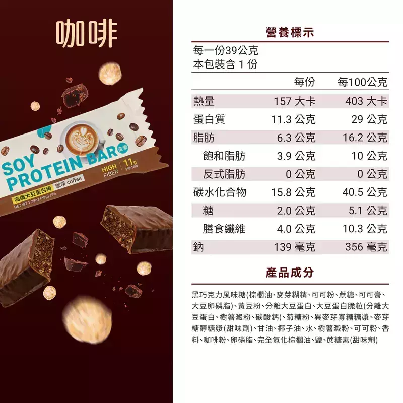 商品詳情 樂維根 大豆蛋白棒 - 咖啡口味 (39g) 選用香醇烘焙咖啡調和濃郁豆香,搭配酥脆有感的獨家大豆蛋白脆脆球,入口帶微苦層次,咖啡控一吃就懂的滿足感☕️無罪惡的營養補給,提神也補蛋白,是嘴饞時刻的最佳理智選擇! THE-VEGAN蛋白棒(咖啡)39g-全素 TWD $45 TWD $45