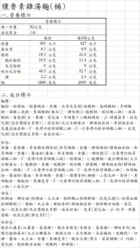 品名 巧食齋_蔬活桶麵_燻香素雞湯麵 (全素) (92g/桶)內容物名稱 ★注意事項 避免陽光直射,常溫保存 本產品含有含麩質之穀物、大豆、芝麻, 本產品生產製程廠房,其設備或生產管線有處理花生、堅果類、蠶豆。內容量 92公克原產地(國) 台灣保存期限 180日廠商名稱 味王股份有限公司